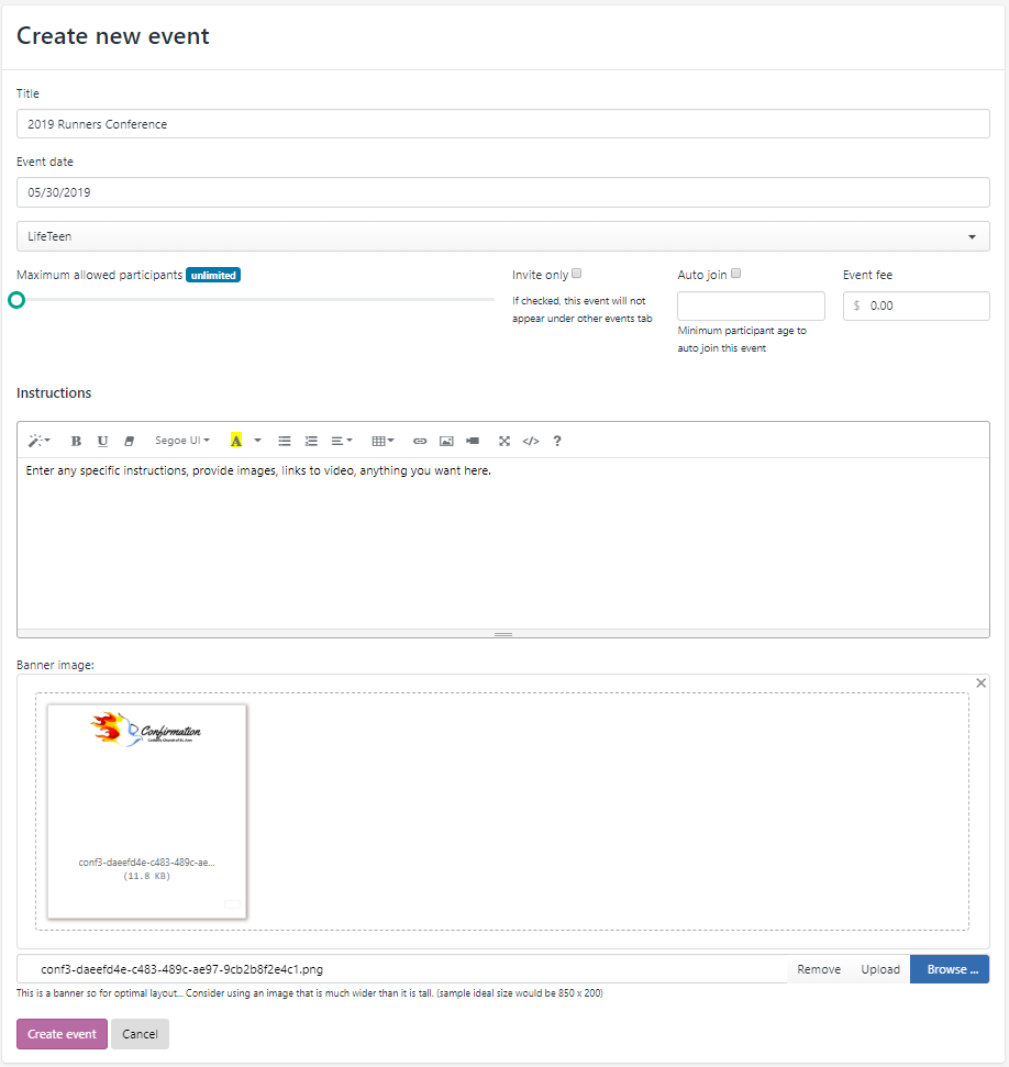 Banner: Everything looks better with a picture. Though optional, it is recommended you include a banner of some sort for your event. Banners are ideally wide images and only a couple hundred pixel tall. Recommended dimensions would be roughly 900x300